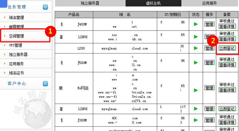 二、 點擊左邊業務管理》空間管理,點擊列表中“立即登記”,進入備案信息提交頁面。