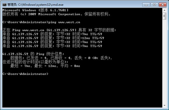 從返回結果中我們可以看到,該域名指向的是61.139.126.59這個IP地址,響應時間最高12ms,最低7ms,網絡非常的好,一般我們需要看的就是兩個值: