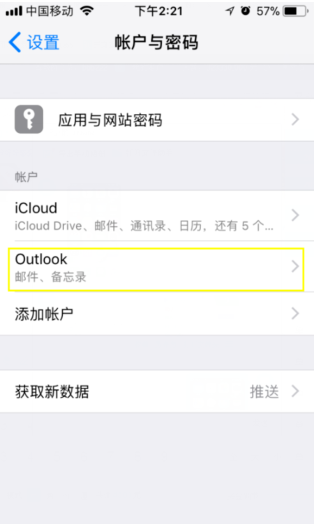 6.我們退到“賬戶與密碼”設(shè)置選項(xiàng)就可以看到了剛才添加的“outlook”郵箱了。