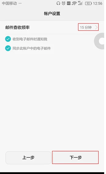 第4步:選擇郵件查收頻率,點(diǎn)擊“下一步”完成設(shè)置