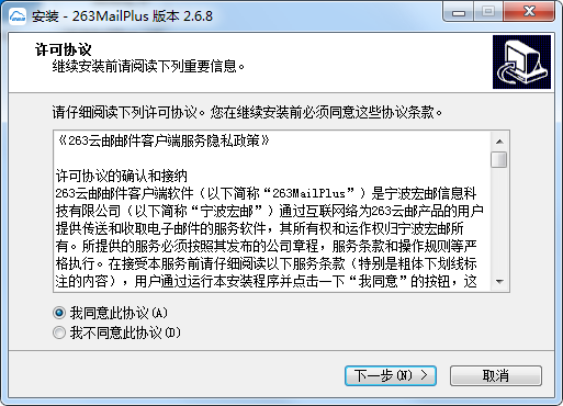 1、在PC下載網(wǎng)下載263企業(yè)郵箱官方版的壓縮包,解壓后,雙擊exe文件,進入安裝界面,查看軟件許可協(xié)議,選擇我接受協(xié)議,點擊下一步