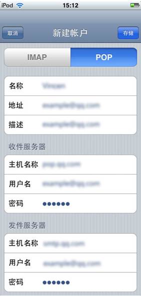 5.點擊“儲存”,手機屏幕的帳戶信息下面會出現“收件服務器”、“發件服務器”的設置信息,則選擇“POP”頁簽。