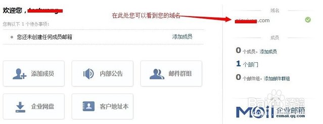 域名解析后,進入企業郵箱的管理頁面,頁面右上角可以看到綁定的域名,至此,免費騰訊企業郵箱開通結束了,如果您想知道企業郵箱更多相關信息,請持續 關注