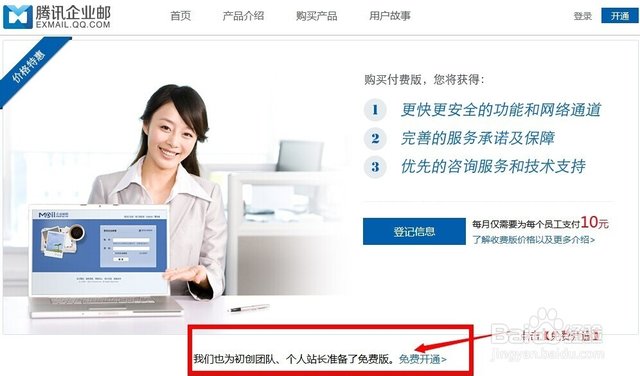 登陸騰訊企業郵箱的網站,網址:http://exmail.qq.com/;點擊頁面右上角【開通】字樣;