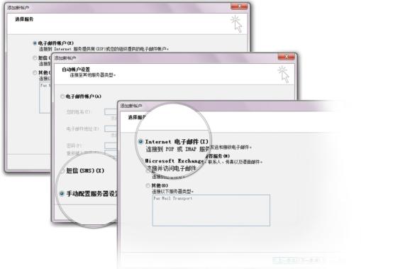 2.1如圖所示,在Outlook中添加賬戶,依次選擇[電子郵件賬戶]-[手動配置服務期設置]-[Internet電子郵件]。