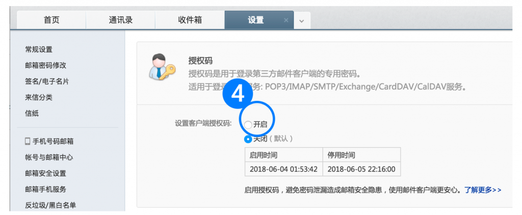 2. 進入設置>POP3/SMTP/IMAP,確認對應服務已開啟,若未開啟,請勾選保存。
