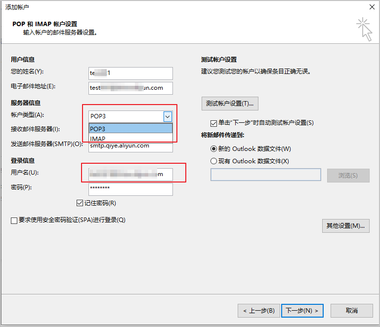 5. 填寫用戶信息服務器信息登錄信息,填寫完成后單擊其他設置。下圖以填寫POP3協議為例。