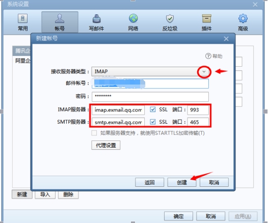 4.接受服務(wù)器類型可以單擊選擇pop3協(xié)議或者imap協(xié)議,一般建議使用imap協(xié)議,可以同步客戶端與網(wǎng)頁端的所有郵件。再設(shè)置服務(wù)器地址,騰訊企業(yè)郵箱imap協(xié)議服務(wù)器地址為:imap.exmail.qq.com,pop3協(xié)議服務(wù)器地址為:pop3.exmail.qq.com,smtp協(xié)議地址為:smtp..exmail.qq.com;SSL選項(xiàng)可勾選可不勾選,后面的端口都會(huì)自動(dòng)識(shí)別。完成以上操作后點(diǎn)擊創(chuàng)建即可。