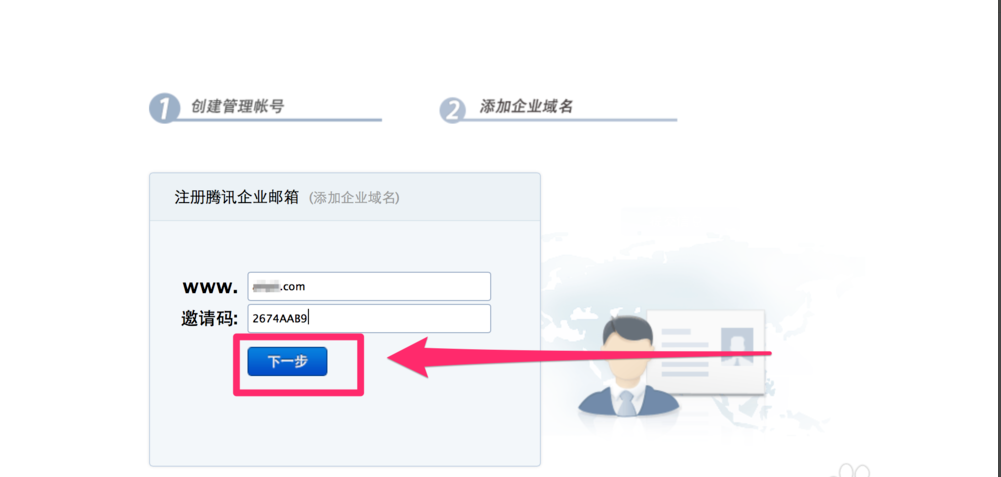 域名和邀請碼,然后點擊頁面下方的“下一步”按鈕進入下一步。(頁面這時候會進入郵箱和