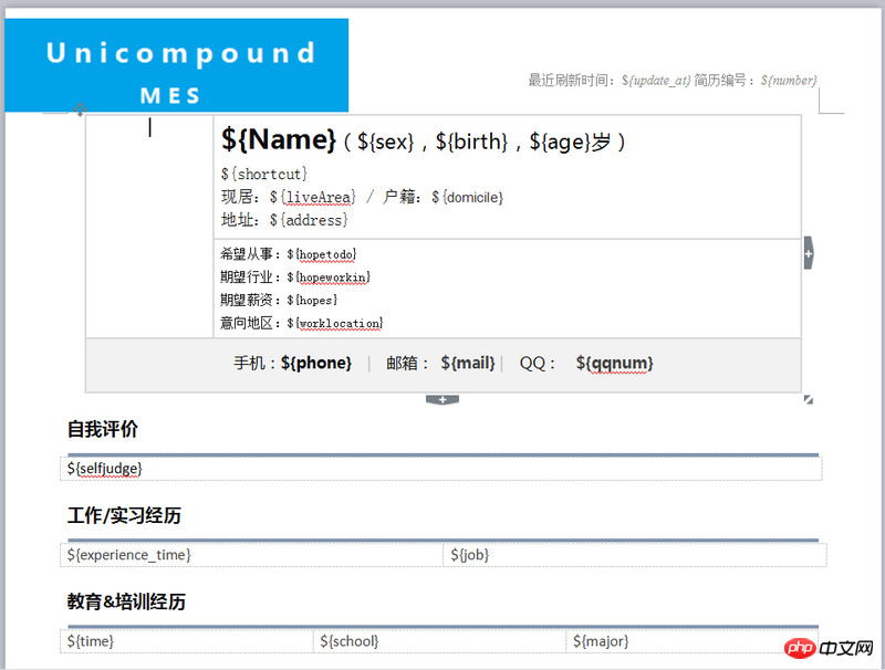從圖中可以看到有一些基本的信息,這些可以從數(shù)據(jù)庫中撈取數(shù)據(jù)。不過這次是直接使用替換的方式,像工作經(jīng)歷和教育經(jīng)歷這種多行表格的模式這里也只需要取一行作為模板即可。