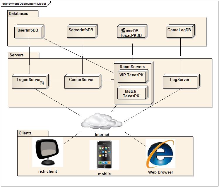 在這個部署中有1個CenterServer,1個LogServer,3個LogonServer和很多個RoomServer(只顯示了德州撲克的兩個房間)。這些Server有可能分布在同一臺機器上,也可以分布在不同的機器之上。這對擴容來說是極為方便地。在玩家數量增大,系統不足以承載其網絡負載時,只需要買更多的機器,架設更多的RoomServer或者LogonServer就行了。