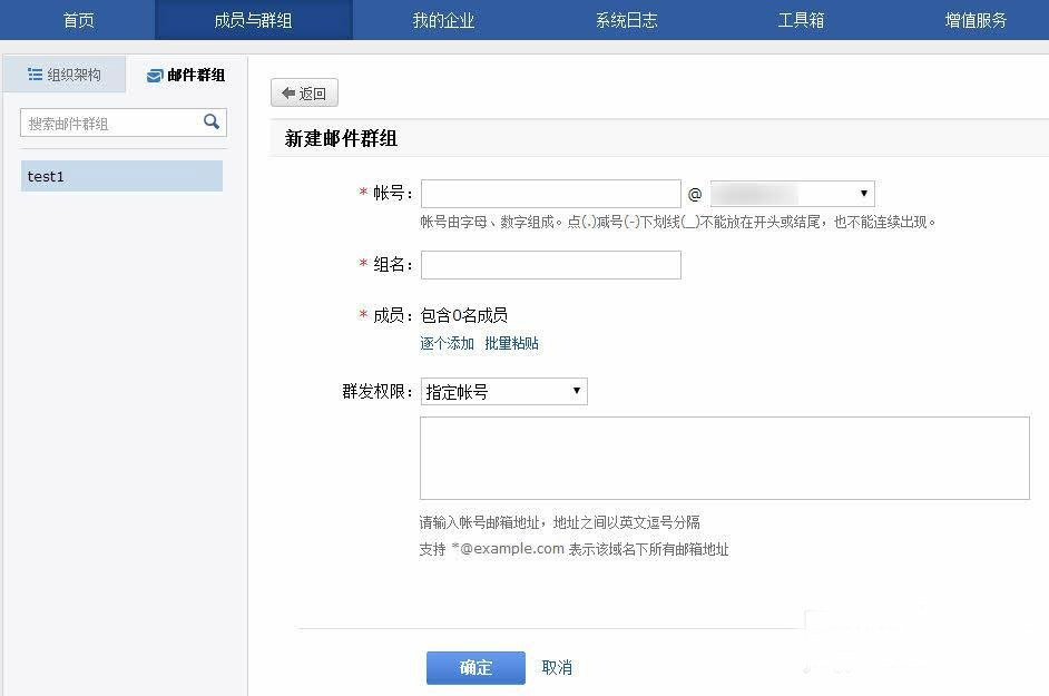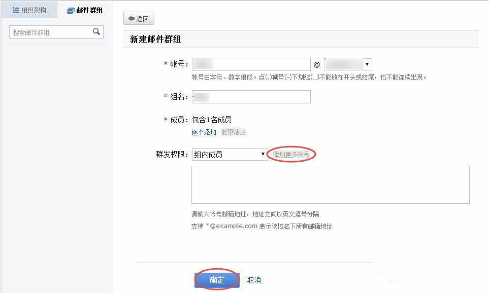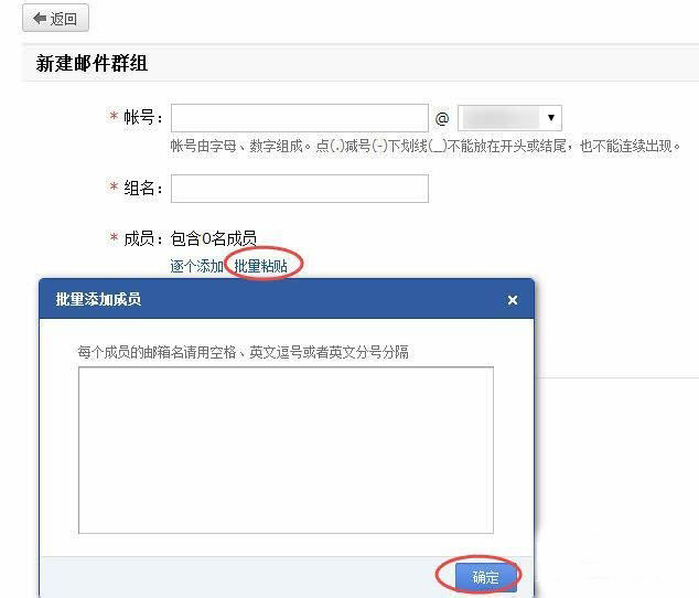 6、也可選擇批量粘貼,輸入成員帳號的郵件地址。全部設置完成后點擊確定即可完成郵件群組的創(chuàng)建。