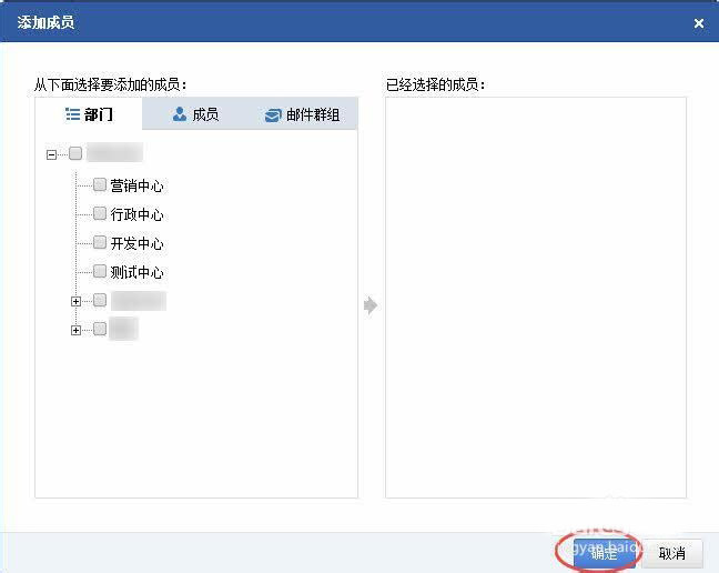 5、在成員下點擊逐個添加,在彈出的窗口中,或選擇部門,或從成員或從另外一個郵件群組中選擇添加,并點擊確定按鈕。