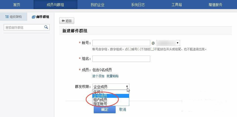 2、輸入帳號和組名,設置可從任何人、企業(yè)成員、組內成員,或指定帳號中選擇。