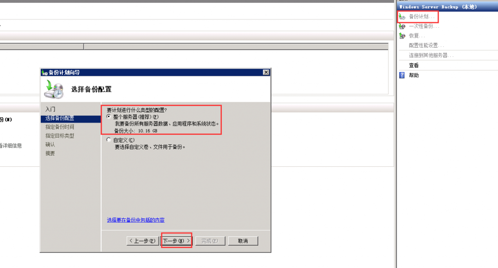 2.在windows server backup窗口的右側(cè)點(diǎn)擊備份計(jì)劃,在彈出的窗口中點(diǎn)擊下一步,選中整個(gè)服務(wù)器,再次點(diǎn)擊下一步。