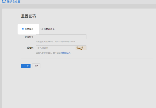 【騰訊企業郵箱->賬號密碼登錄->忘記密碼->我是成員->輸入賬號信息】使用綁定的手機號碼接收驗證碼重置郵箱賬號密碼。