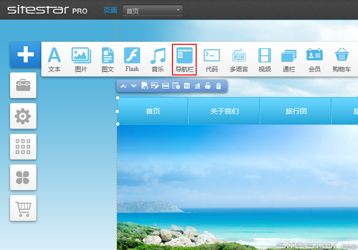 導航條添加成功后,如果不喜歡默認的樣式或者顏色,您可以對這些進行調整。導航條的工具條上有多個功能,我們會重點說一下第3個至6個功能: