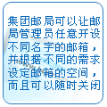 說明:多種款式,并可隨時增添空間和郵箱;強大的后臺管理,可隨時開設郵箱、別名,并可隨時關掉某個郵箱,防止商業機密泄露。支持WEB、POP3、IMAP等多種收發方式。郵件拒絕功能,讓你遠離垃圾郵件。